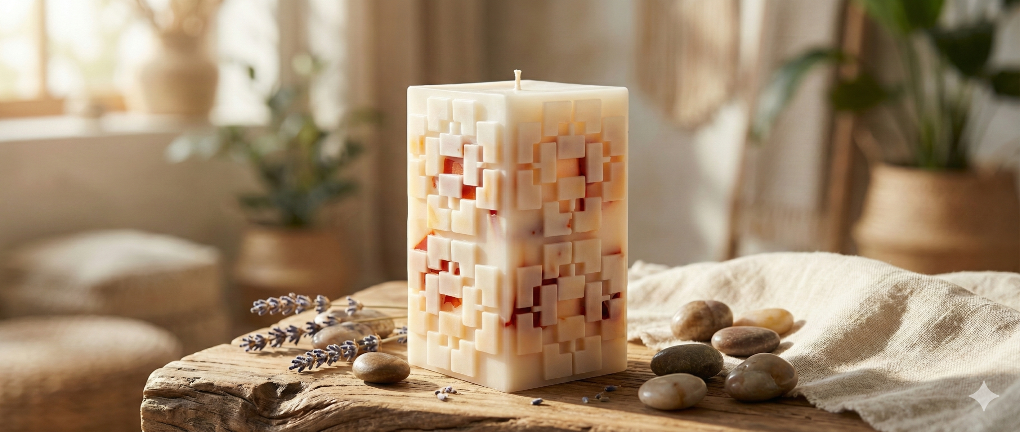 Hand-crafted with precision and artistry. We carefully arrange the interior wax chunks by hand to create a stunning, textured finish. This process ensures that every single candle possesses its own unique character—no two are exactly alike.